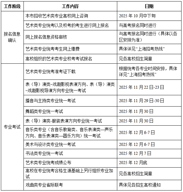 上海市2026年普通高校艺术类专业报名考试工作日程表